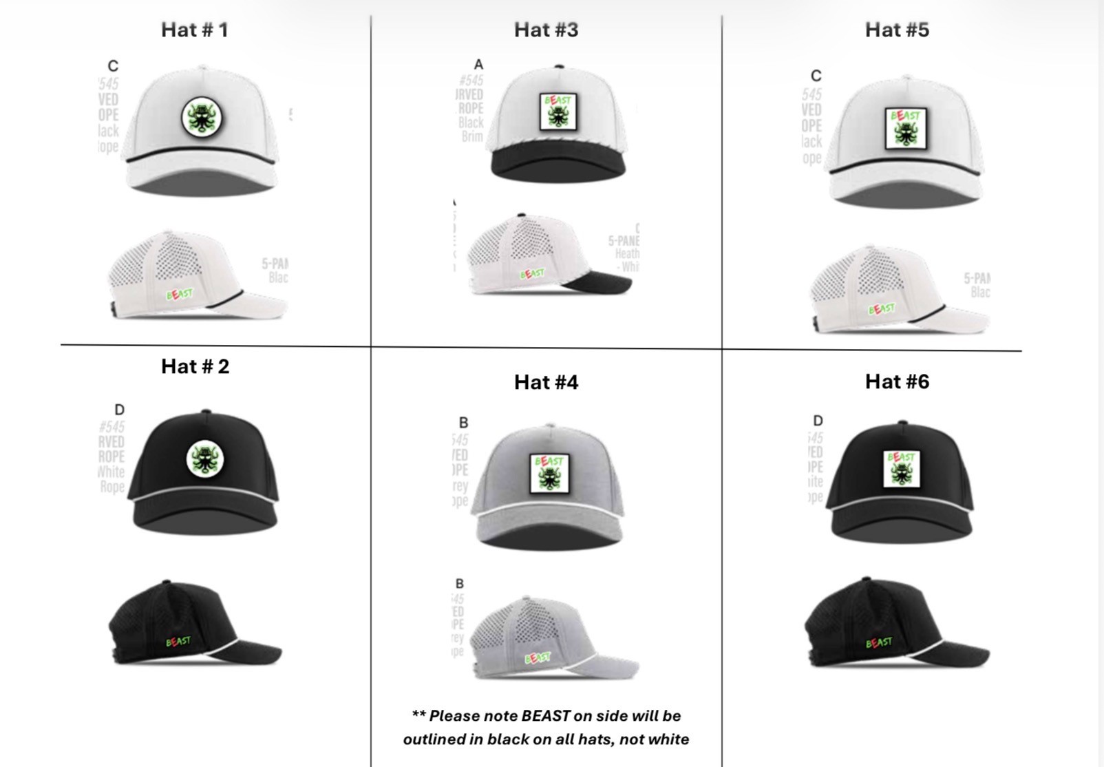 We're going to put in another order for Beast hats this summer, and in order to get the first order in before our first tournament, we'll need the order submitted no later than February 18, 2026. Below are the 6 options to choose from. Once you've decided which hat(s) you'd like to order, update the order form below with the details!